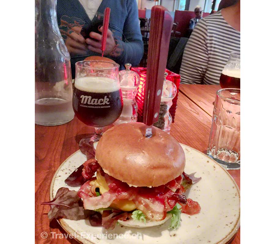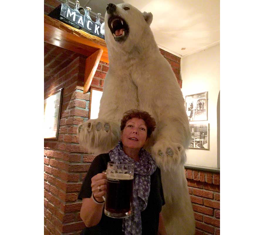 Jetzt haben wir uns aber ein Bier verdient! In der Ølhallen (Bierhalle) tauschen wir die Feuchtigkeit von oben gegen Feuchtigkeit für die Kehle ein. Die Ølhallen gehört zu Macks Ølbryggeri, der nördlichsten Bierbrauerei der Welt. Sie wurde 1877 von Ludwig Mack gegründet und ist noch heute in Familienbesitz. Das Juleøl (Weihnachtsbier), das es hier auch im Sommer gibt, hat uns erfrischt. Die Besonderheit dieser Bierhalle: hier wird schon am Vormittag Bier ausgeschenkt, was für Norwegen sehr ungewöhnlich ist. Für tierische Aufmerksamkeit sorgt schliesslich der ausgestopfte Eisbär, der ein gutes Fotomotiv abgibt.