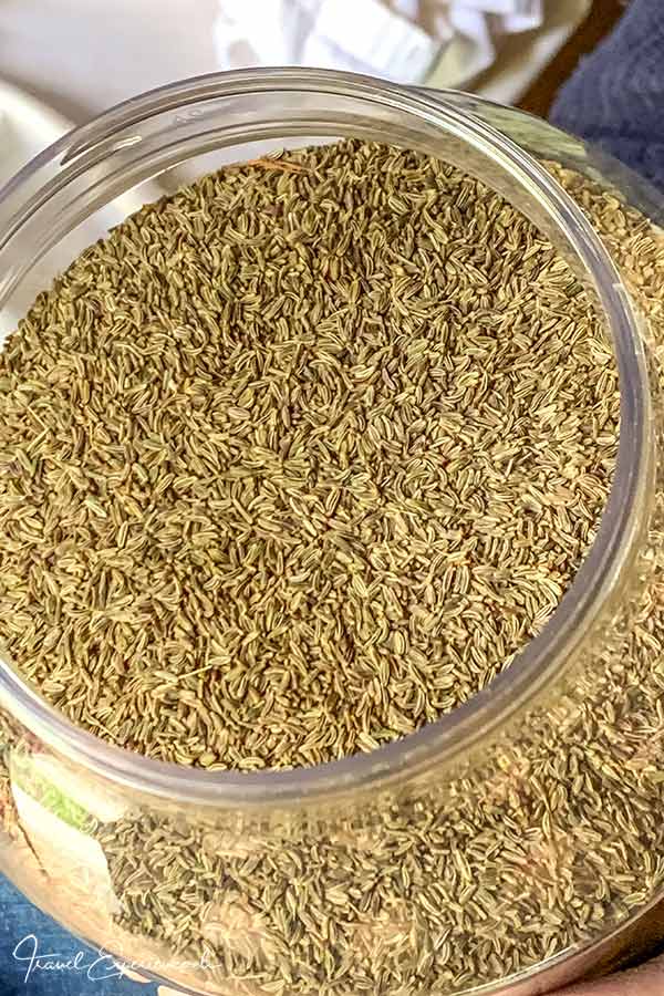 In seinem Kümmellager hängt er die Büschel in Kopfkissenbezüge gehüllt auf und lässt alles schön trocknen. Wenn die Zeit reif ist, schüttelt und klopft er die Pflanzen, damit die Samen in den Kissenbezug fallen – et voilà: der Kümmel ist geerntet. Christian hält mir ein Glas voller Kümmelsamen unter die Nase und ich bin überrascht, wie viel frischer und würziger sie duften, als das, was ich aus dem Gewürzregal vom Grossverteiler her kenne.